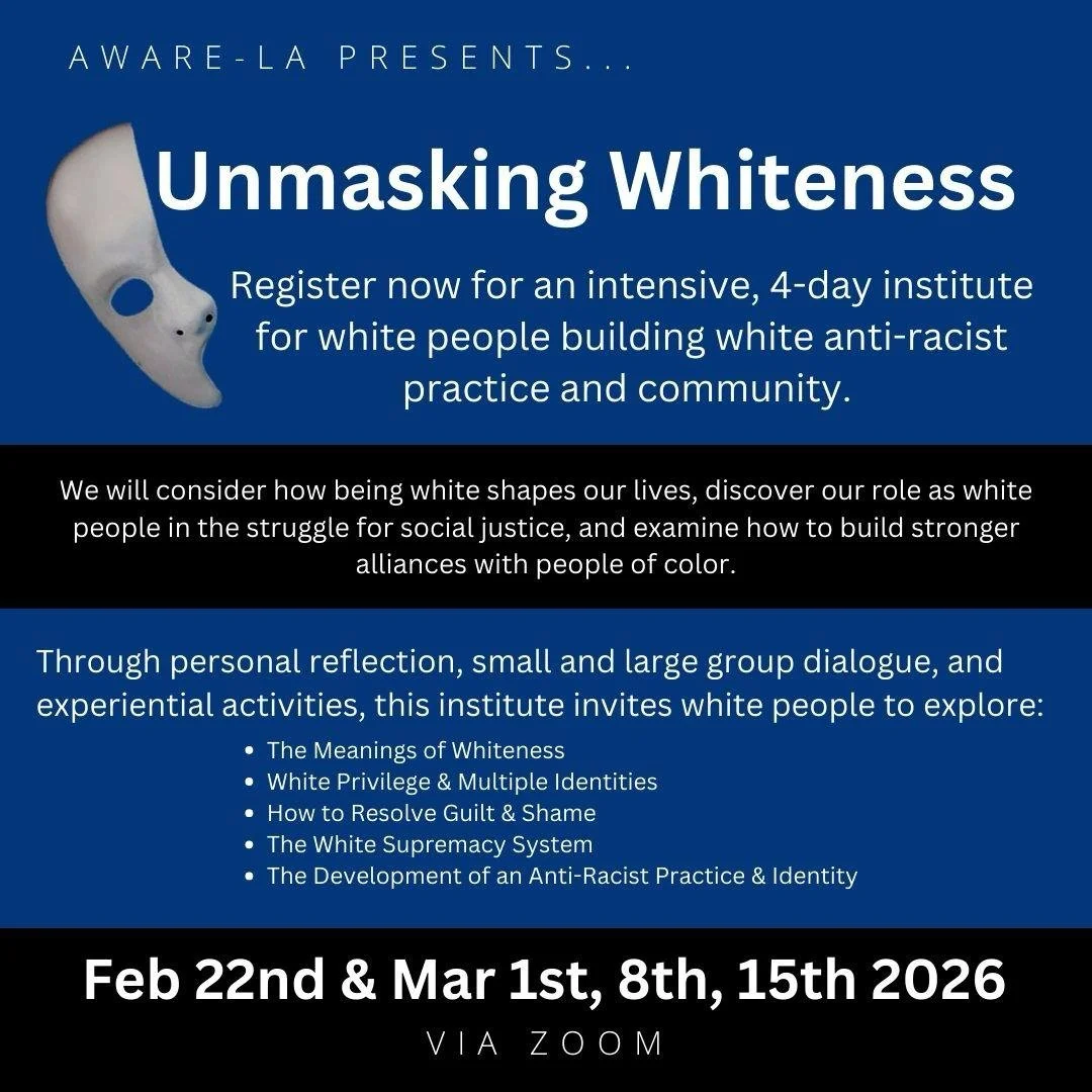 The Winter 2026 Unmasking Whiteness Institute (on Zoom) is postponed, with a future date TBD. The Summer Unmasking Whiteness Institute will be in person in Los Angeles (date also TBD). If you are interested in attending a future session of Unmasking Whiteness (in person or virtual), please fill out our interest form here.